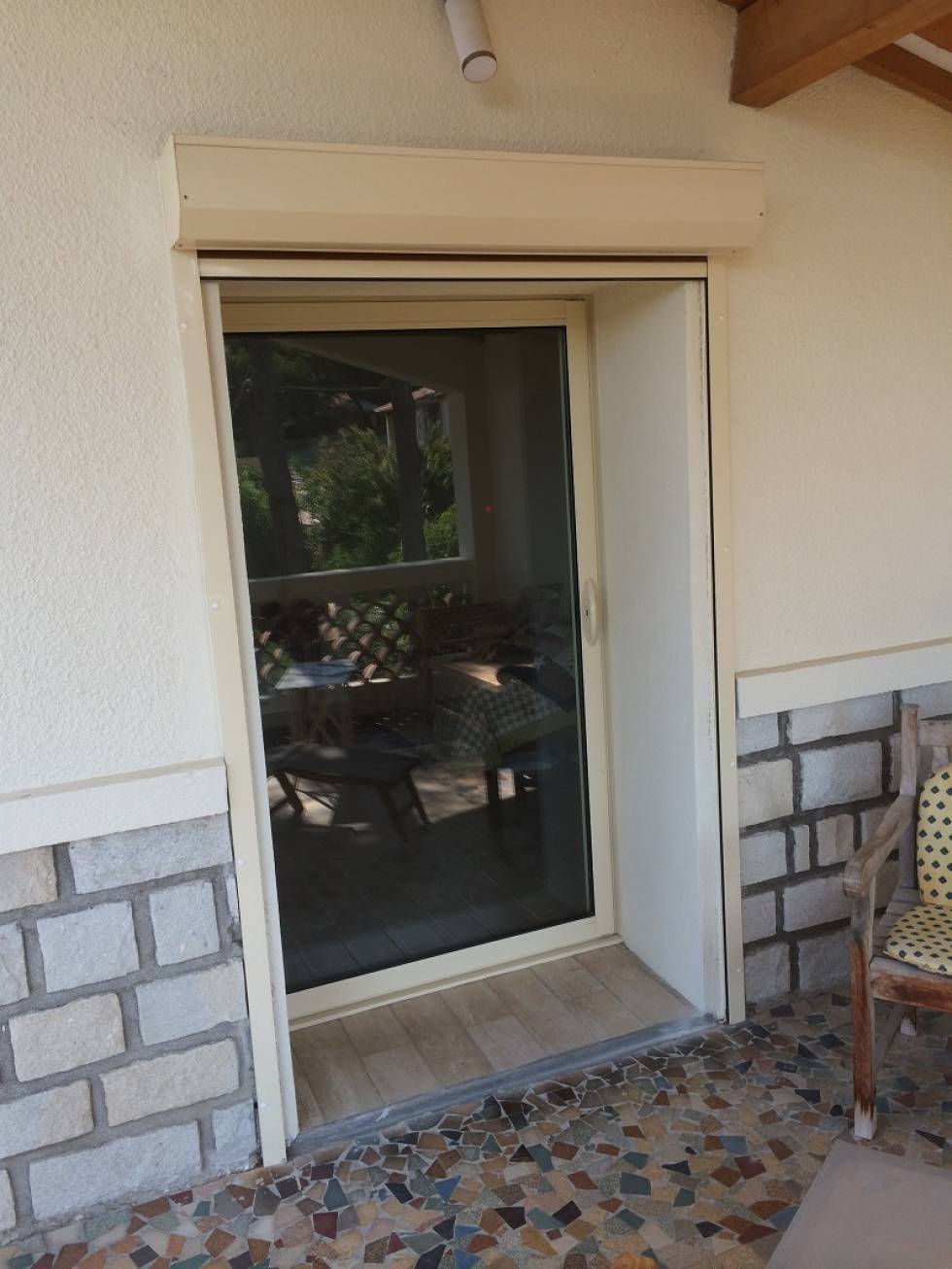 NAD a fabriqué et posé cet ensemble de menuiseries en aluminium laqué couleur beige. Cet ensemble de menuiseries installé par NAD est composé de 2 fenêtres (l'une coulissante et l'autre ayant 2 ouvrants dont 1 oscillo battant) et de 2 chassis à galandage.